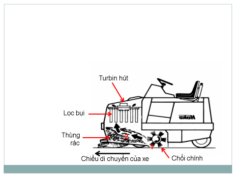 Chổi bên quay sẽ gom rác, bụi vào giữa xe, sau đó chổi chính sẽ hất rác, bụi bay vào thùng chứa theo chiều mũi tên như hình bên (hình 2.1). Trong quá trình quét thì sẽ có một lượng bụi mịn nhẹ bay lơ lững lên trên, tuabin quay sẽ tạo ra lực hút để hút hết tất cả lượng bụi bay lơ lững đó bám vào lưới lọc chắn phía trên để không cho lượng bụi này bay ra ngoài môi trường. Mặt trên của lưới lọc bụi có gắn 2 motor để rung giũ bụi rớt xuống lại thùng chứa. Và khi xe đi qua thì mặt sàn sẽ sạch như ta mong muốn. Khi thùng rác chứa đầy thì người vận hành chỉ cần gạt cần điều khiển để hệ thống thủy lực sẽ tự nâng đổ rác.