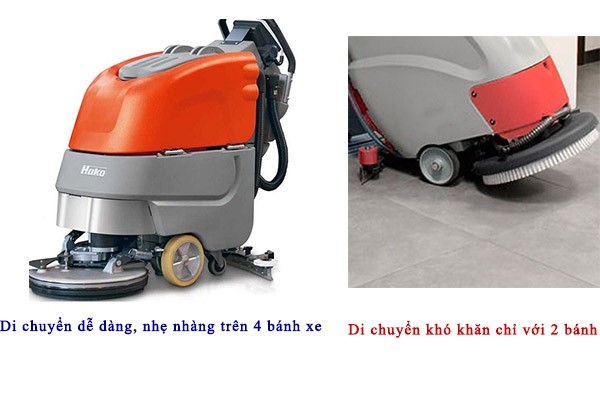 Hệ thống di chuyển ảnh hưởng trực tiếp đến người vận hành và năng suất làm việc vì vậy khách hàng phải lưu ý khi chọn mua máy chà sàn. Cụ thể như những máy chà sàn được sản xuất ở Trung Quốc hay Châu Á thì có hệ thống di chuyển của máy chỉ bằng 2 bánh xe (hình bên dưới), do đó khi di chuyển máy sẽ không được thăng bằng và cần phải tốn nhiều lực, gây bất tiện cho người sử dụng nên năng suất làm việc cũng giảm. Ngược lại những máy chất lượng của Châu Âu đều có 4 bánh xe để máy di chuyển được thăng bằng và dễ dàng hơn.